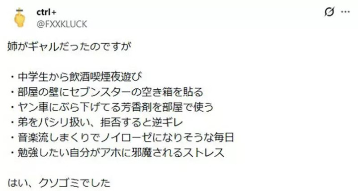 国中就开始抽烟喝酒、夜不归宿;房间贴满香烟盒;把弟弟当跑腿工具人;每天放音乐吵到全家崩溃;周围全是不良少年。