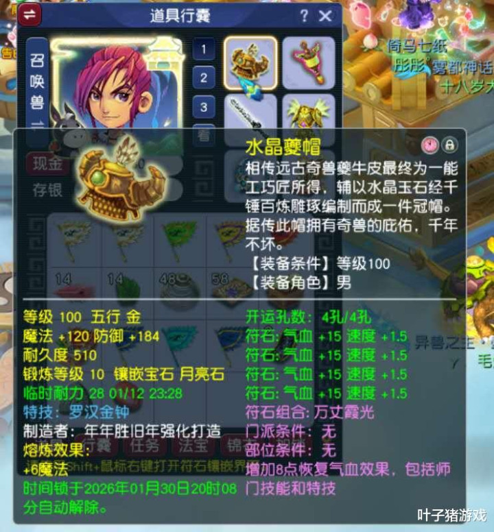 由于剧情道具为绑定状态,这件罗汉头盔也随之获得了罕见的“红锁”标识。