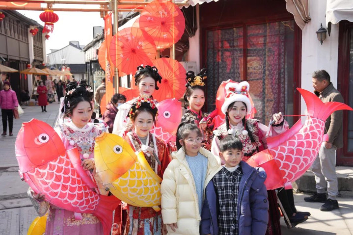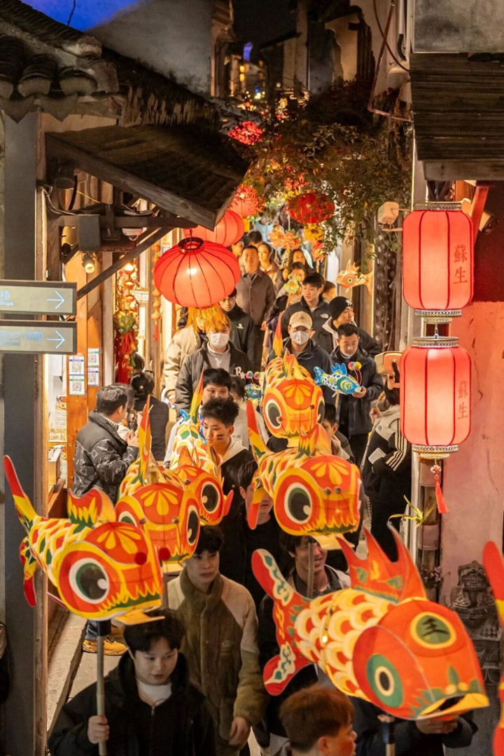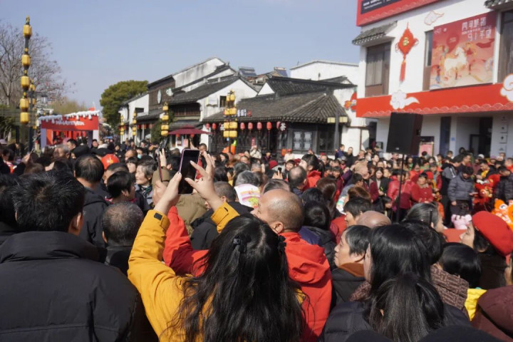 惠山古镇莫得"免费"这张牌,但它有"人烟气"这张王牌。国风巡游、财神NPC、高跷扮演、舞狮腾踊,复刻了千年江南庙会的淆乱表象。