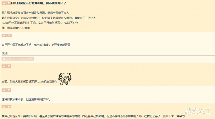 该帖主发了一个帖子,标题为“团长们实在不想为爱发电,要不就别开团了”,帖子内容表示,现在集合石大部分都是包橙团,很久都组不到人。该帖主还说好不容易进了一个团,一开始说没有包橙的,但快组满时就说有包橙的,这时走了几个人,并且帖主表示“R300 已经不能满足你们了吗,实在不行就别硬写‘w 以下均分’”。