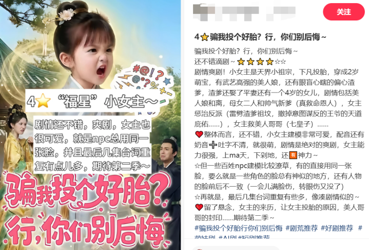 此外,AI生成也不错隐蔽部分制格调险。本年广电总局对儿童类微短剧进行料理后,各平台王人不再禁受萌宝题材的簿子,一些仿真东说念主短剧运转用AI生成合乎条件的萌宝形象,隐蔽未成年东说念主拍摄风险。刚竣事的辉煌假期,一部评释天界小先人下凡的《骗我投个好胎?行,你们别后悔》置身红果热播榜前三,内部的主角萌宝“时叶”就是由AI制作。