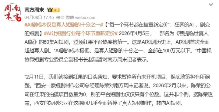 这次《菩提临世真东说念主AI版》霸榜,标识着AI制作正在进一步侵蚀真东说念主短剧的流量基本盘。比较之下,真东说念主短剧的寒意则显得愈发彻骨,尤其是竖屏短剧,不仅开机量节节下滑、演员片酬暴减,最近还爆出了制作方欠薪事件。