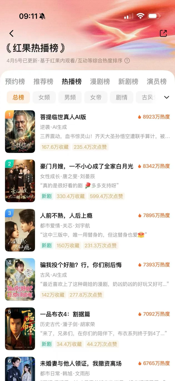 进入4月以来,红果短剧总榜前5中,频繁有一到两辖下于AI仿真东说念主剧,既有男频类型也有女频类型。