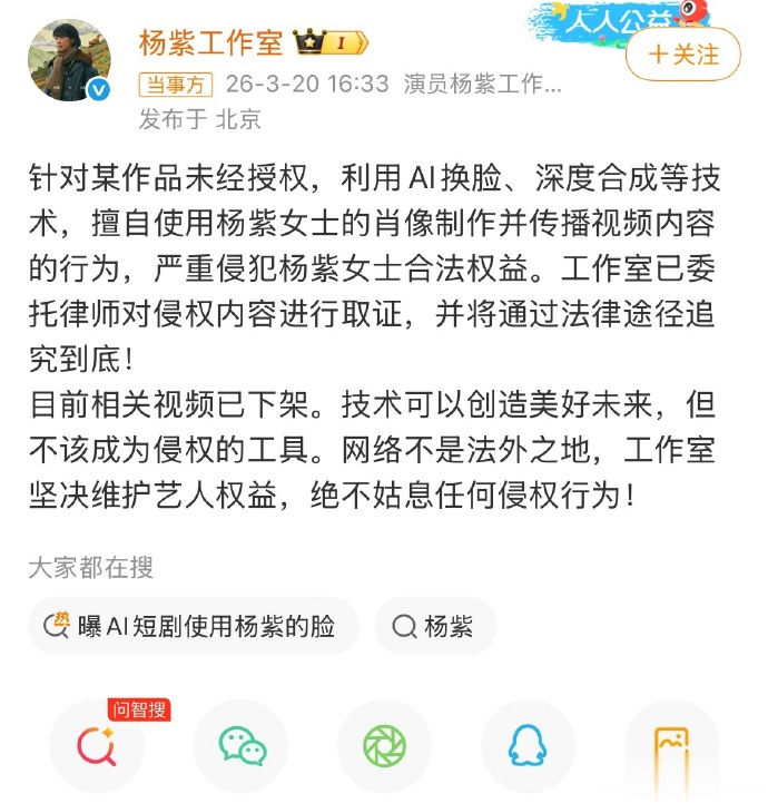 最近,龚俊、易烊千玺、杨紫等演员王人公诞生布维权声明,左右AI短剧私行盗用肖像、声息合成造谣形象用于谋利。除了高有名度的艺东说念主,有自媒体博主也发文示意,短剧《桃花簪》未经授权使用了我方肖像特征生成剧中邪派变装。