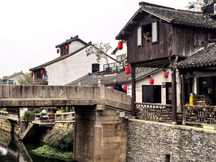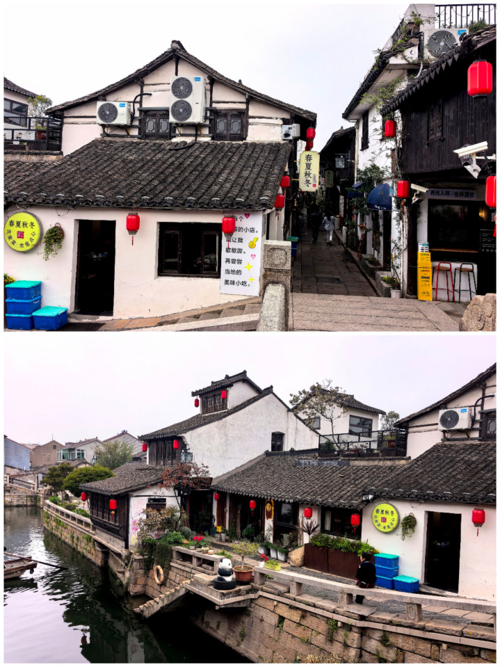 站在洪福桥上鸟瞰,河说念波折,两岸的白墙黑瓦临水而建,临河的木楼挂着红灯笼,与灰蒙的天外造成冷暖对比,顺手一拍齐是电影质感的画面。当地东说念主坐在桥边石阶上谈天,时光在这里慢了下来——就像古镇的盐商旧时光,畴前这里曾经是漕运与商贸的重要,每一块桥板齐藏着“小小新场赛苏州”的过往。