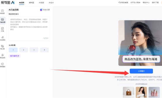 进入易可图的 AI 万能改图功能页面,点击上传图片按钮,这里可以上传一张或多张需要处理的照片,最多同时处理30张图片。