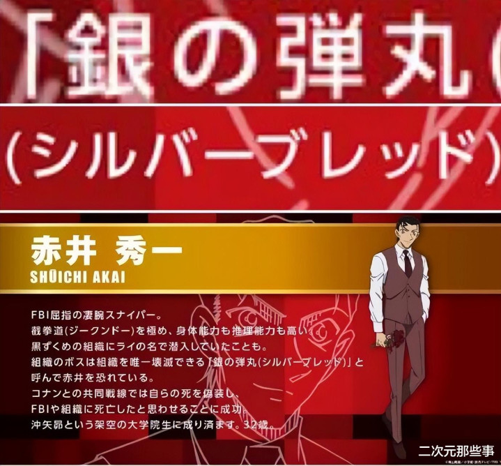然而令人意外的是,刚刚更新的赤井秀一专题介绍中,官方却犯下了一个令人啼笑皆非的低级失误。熟悉作品的粉丝都清楚,赤井秀一作为FBI顶尖特工,凭借超强的实力与对黑衣组织的致命威胁,被黑衣组织称作“银色子弹”,但此次展览的官方介绍中,却将“银色子弹”错写成了“银色面包”。