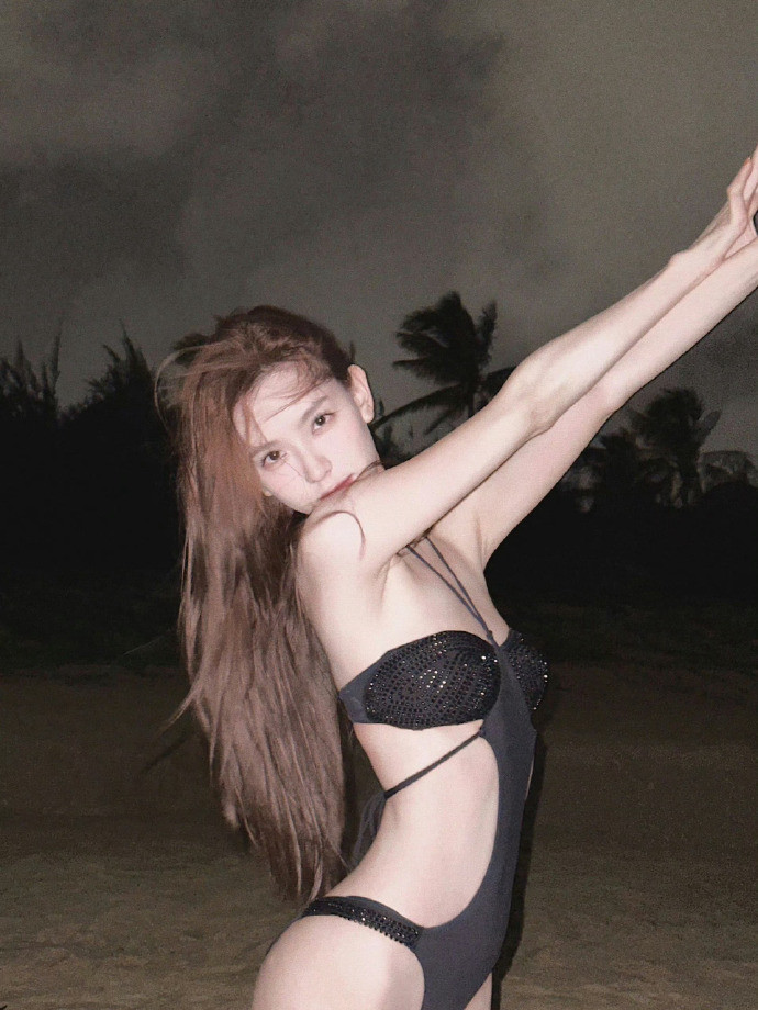 她身着玄色比基尼,贴身剪裁勾画出紧致弧线,马甲线昭彰可见,