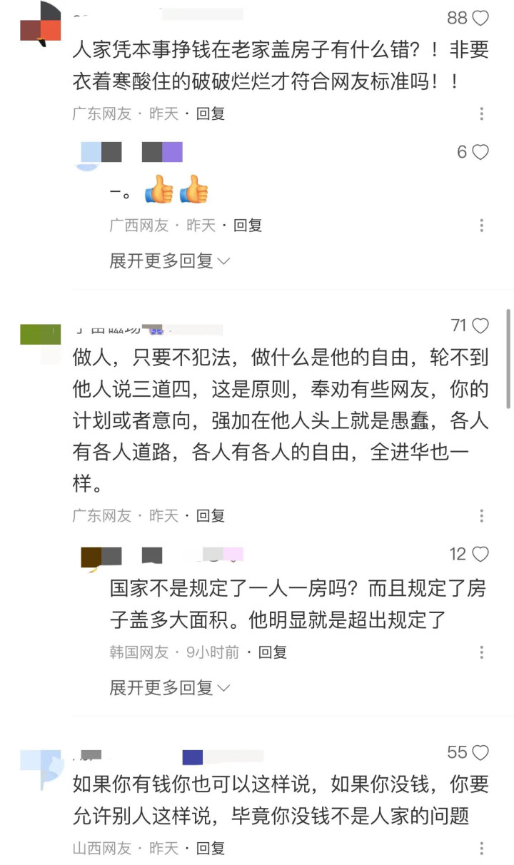 对此网友表示:“人家凭自己本事赚钱,在老家盖房子有什么错?”