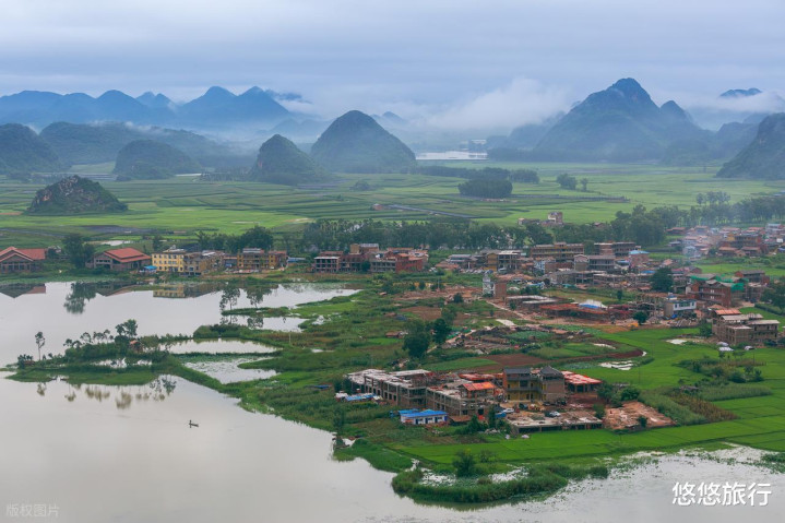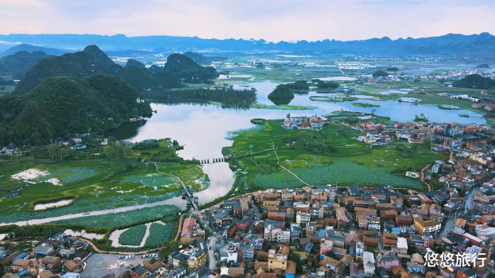 五六月的普者黑,桃花谢了,荷花没开。民宿窗外唯一山水和新长的稻田。